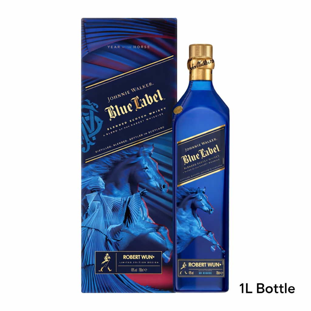 Celebrate the Year of the Horse with this stunning limited edition Johnnie Walker Blue Label, exclusively designed by renowned fashion artist Robert Wun. This 1L bottle features a captivating art-wrapped design inspired by the horse's powerful symbolism of progress and strength. A masterpiece of creativity and craftsmanship, this special Lunar New Year 2026 release combines Johnnie Walker's iconic premium blended Scotch whisky with contemporary artistic vision. Perfect for collectors and those seeking a meaningful gift that honours tradition while embracing modern design. A truly exceptional addition to any collection.